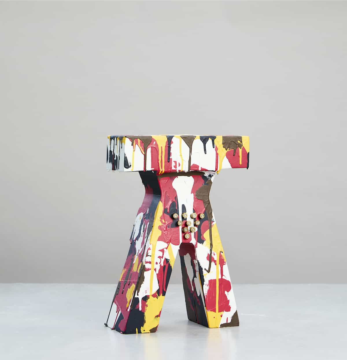 This artwork is an abstraction of the woman form, a curves-inspired angular piece of functional sculpture. The bullet shells congregated at the “crotch” of the pedestal illuminate the endurance in the face of abuse that the most demarcating, most powerful, pleasureful and life-symbolic part of a woman’s body represents. The color scheme alludes to the vast shades of the human race.
