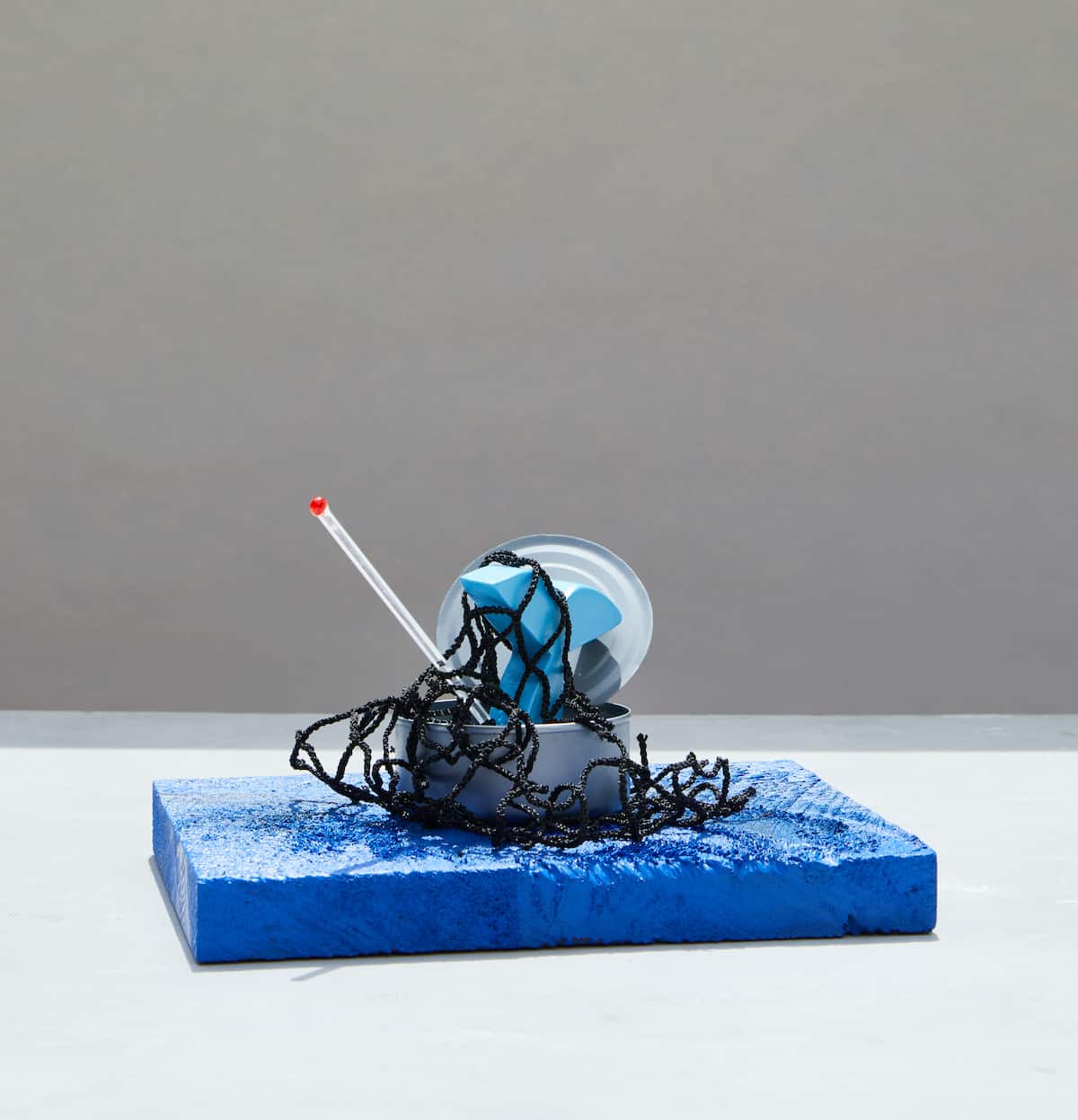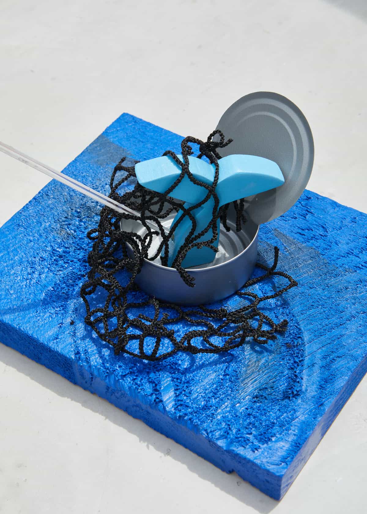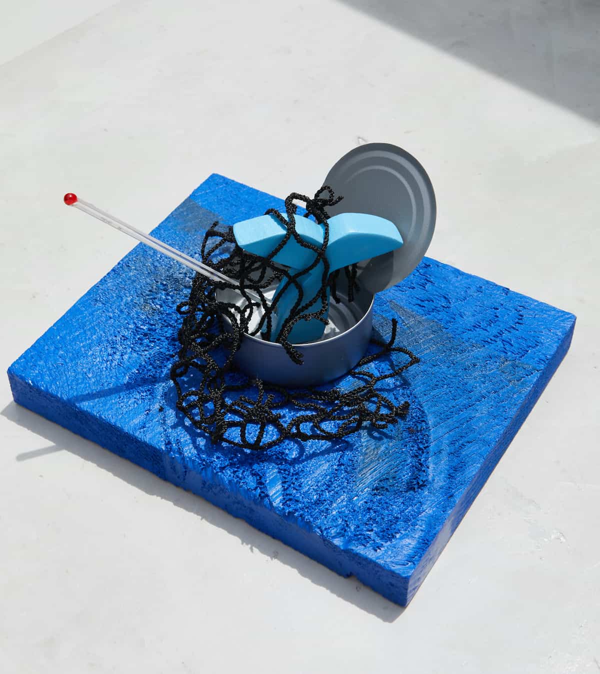 A niche commentary on canned fish, this sculpture derives its title from a series of Star-Kist Tuna TV advertisements that aired during the 1960s. The series follows the under-the sea misadventures of Charlie the cartoon fish, who is constantly being denied Star-Kist’s dangling hook, because they only take “the best” fish. Here, in Andy’s interpretation, the tuna can is entangled in a net, with a half-fish having nose-dived into its abyss. A mercury-filled thermometer acts like a spear, symbolic of both the death of the creature, and the mercury poisoning we ourselves digest through our over-consumption of fish.