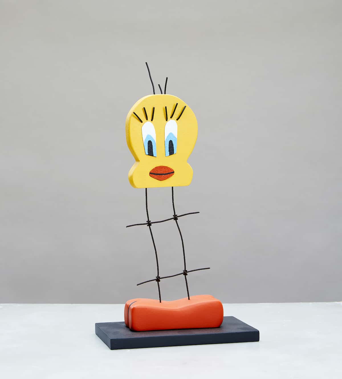 After recognizing that the cross-wires of some rusted fencing resembled a hashtag, Andy configured a Tweety Bird character atop the set of precarious-seeming “legs” of the symbol. Himself averse to Twitter, he says that “most Tweets do not reach the intelligence level of what I consider the original